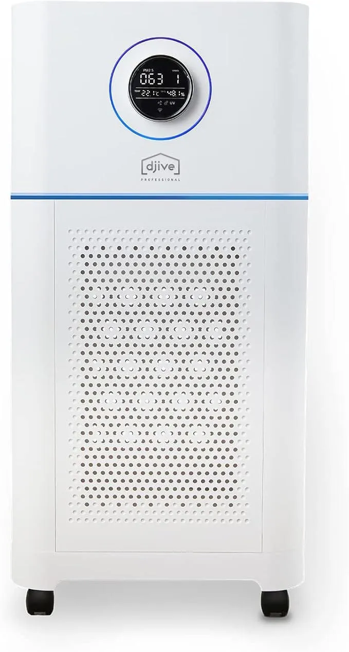 Puissance de nettoyage puissante : le PURE 800 nettoie une pièce de 100 m² (à 800 m³/h) en seulement 60 minutes avec une puissance CADR de 427 m³/h. Idéal pour les bureaux, les écoles, la gastronomie et les institutions médicales. Filtrage à air multi-étages : pré-filtrage HEPA 14 & charbon actif, UV C & négatifs éliminent plus de 99,995% des virus, bactéries, agents pathogènes, aérosols, pollen, fumée, poussière et moisissures de l’air – Idéal pour les personnes souffrant d’allergies. Humidification et nettoyage 2 en 1 : en plus du filtre à air à plusieurs niveaux, l’humidification à ultrasons hygiénique avec un réservoir d’eau facile à remplir assure un climat ambiant agréable et sain. Facile à utiliser : avec les trois options de télécommande, l’application smartphone et élément de commande directement sur l’appareil, le djive PURE 800 offre un accès facile et rapide à toutes les fonctions. Ecran multifonction : l’écran LED informe en continu de la qualité de l’air et de l’humidité actuels, et le pavé tactile permet de contrôler toutes les fonctions. Grâce à ses performances avancées, il purifie efficacement votre intérieur en éliminant poussières, allergènes, virus et bactéries pour une protection optimale de votre santé. Son fonctionnement particulièrement 26 db vous permet de profiter pleinement d’un environnement calme et serein, que ce soit dans votre salon, votre bureau ou votre chambre.