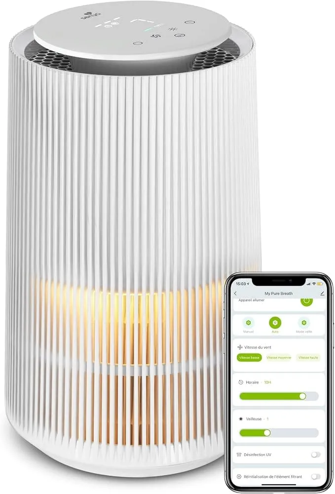 SENYA propose la meilleure variété de produits de bonne qualité. Il suit des normes plus élevées en matière de satisfaction des clients. Meilleur prix. PURIFICATEUR D’AIR A FILTRES : Constitué de 3 filtres (préfiltre, HEPA H13 et charbon actif) pour éliminer 99,97% de particules ultrafines et assainir l’air. Idéal pour soulager les allergies et les pathologies respiratoires (ex: asthme). 5 MODES DE VENTILATION : Basse, moyenne, rapide, automatique ou veille. Le débit d’air atteint 250 m3/h pour assurer la ventilation et couvrir efficacement une surface de 30 à 60m². Lorsque la lumière UVC est allumée, elle émet des rayons ultraviolets pour détruire les bactéries. QUALITE DE L’AIR EN TEMPS REEL : La couleur affichée sur l’écran (vert, orange ou rouge) indique la qualité de l’air définie par le capteur grâce à l’indice sur les particules fines PM2.5. SILENCIEUX : Même à vitesse haute, l’intensité sonore ne dépasse pas 56 dB. L’appareil est donc très silencieux et peut être utilisé pour filtrer l’air à la maison (même la nuit dans la chambre) ou au bureau. De plus, il dispose de 3 niveaux de luminosité (faible, moyenne, élevée) pour servir de veilleuse. CONNECTE : Le purificateur d’air est équipé d’une minuterie pour un arrêt automatique. Vous pouvez aussi contrôler de purificateur à distance pour garder un air pur et frais toute la journée via l’application Senya Smart. L’appareil est également compatible avec les assistants vocaux Google Home et Amazon Alexa. Grâce à ses performances avancées, il purifie efficacement votre intérieur en éliminant poussières, allergènes, virus et bactéries pour une protection optimale de votre santé. Son fonctionnement particulièrement 56 db vous permet de profiter pleinement d’un environnement calme et serein, que ce soit dans votre salon, votre bureau ou votre chambre.